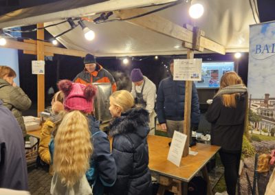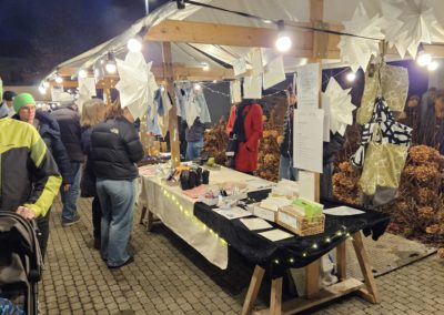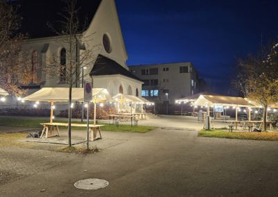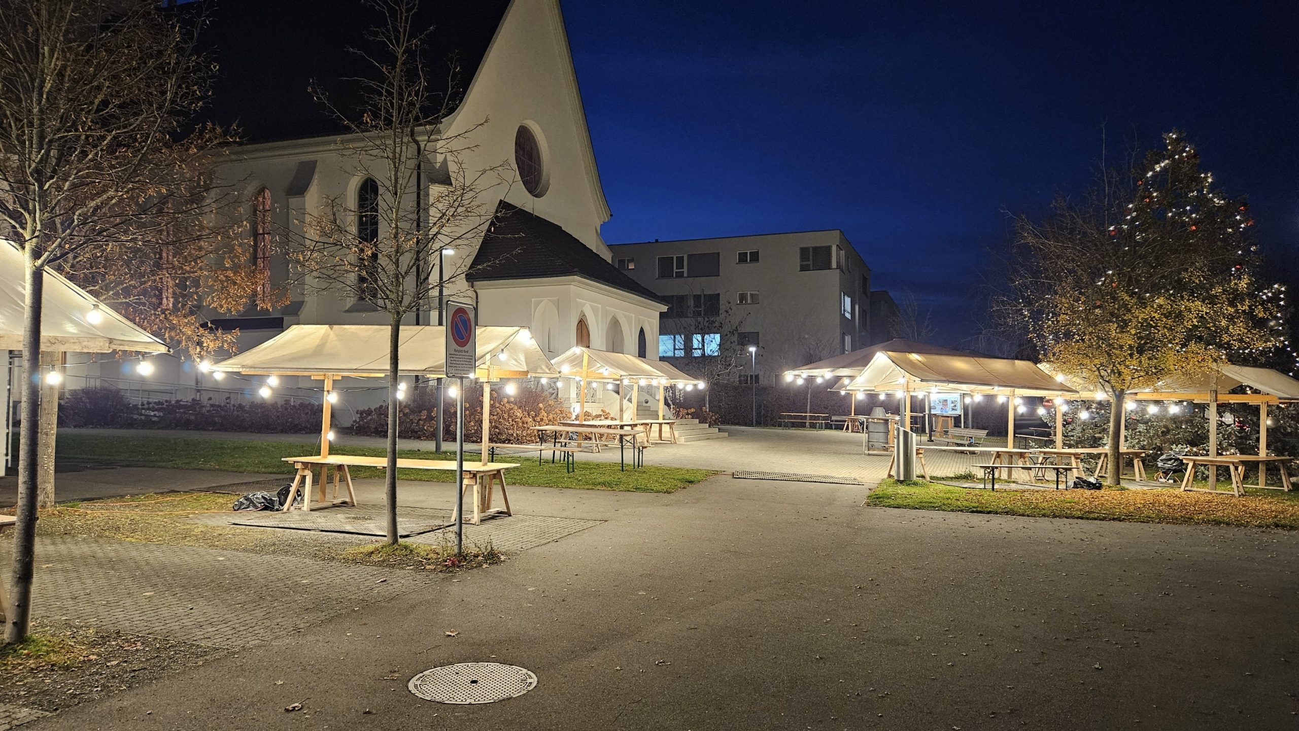 Am Donnerstagabend ist alles bereit, Marktstände mit Beleuchtung. Ab Freitagmittag werden die Markstände und die Kaffeestube eingerichtet.